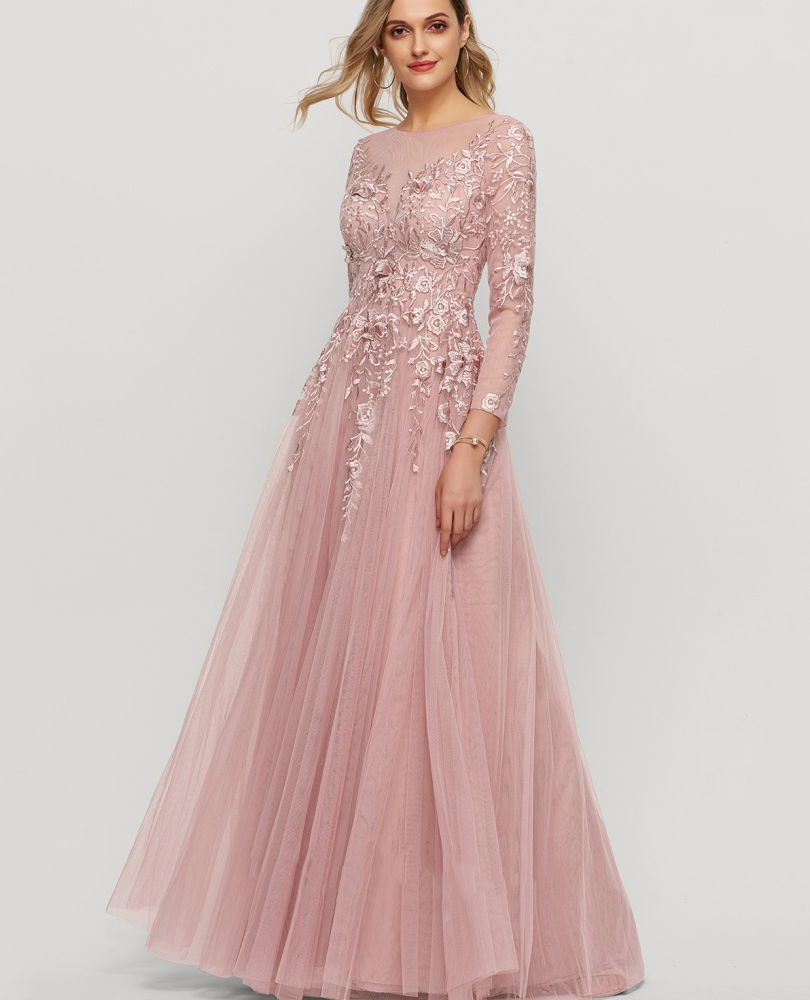 O-Neck Tulle Applique Ankle-Length Prom Dresses, Long Sleeves A-Line Party Gowns