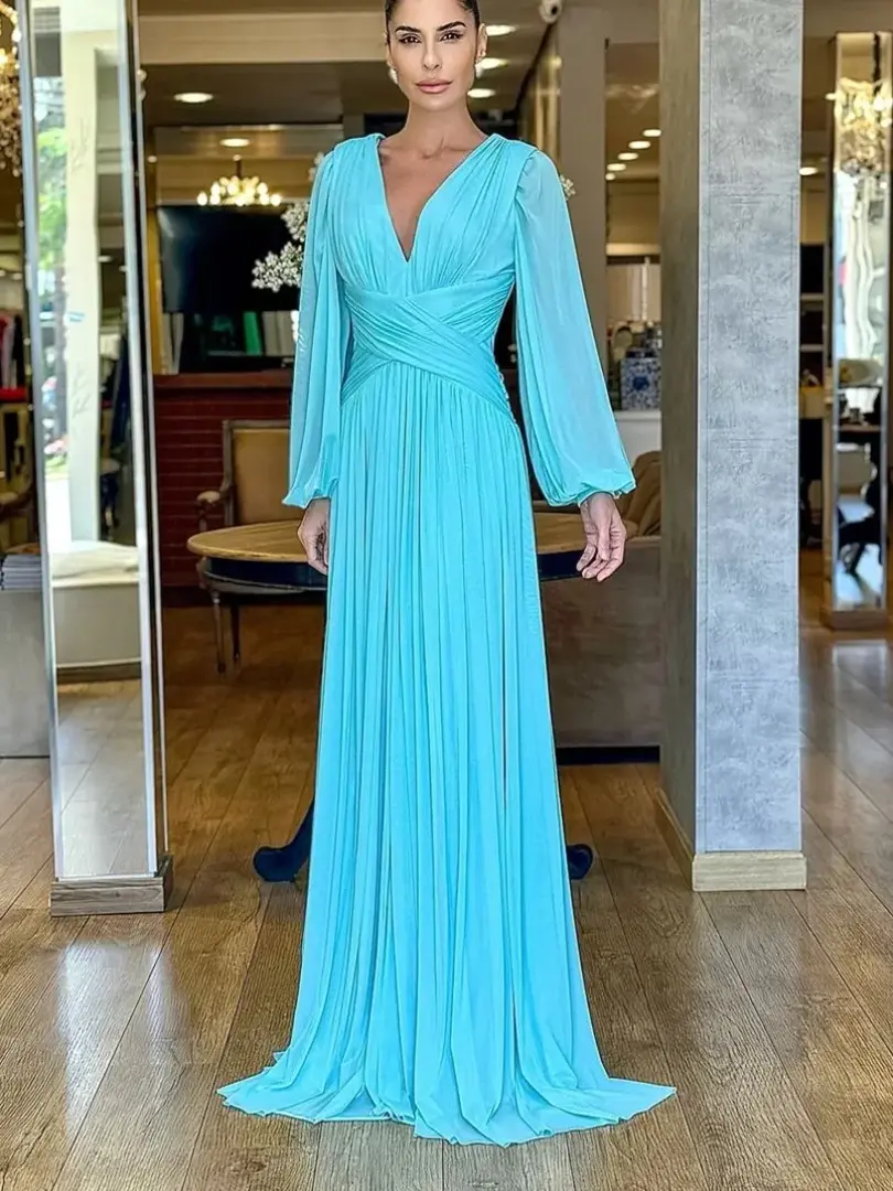 Tags:V-neck chiffon evening dress, floor length formal gown, A-line pleated dress, elegant evening wear, long sleeve evening dress, ruched formal dress, sweep train evening gown, classic style evening dress, formal dress with built-in bra, polyester chiffon dress, affordable evening dresses online, best evening dresses for women, formal dresses for all ages, V-neck formal dresses for wedding guest.