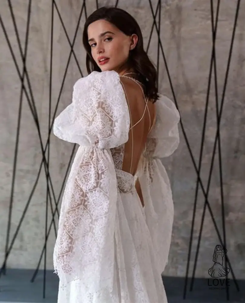 Tags:Custom wedding dress with sleeves, boho lace wedding dress, empire waist wedding dress, long sleeve lace bridal gown, floor length wedding dress, custom size wedding gown, white lace wedding dress, v neck wedding dress, backless wedding dress, A line wedding dress, summer wedding dress, affordable custom wedding dress, plus size lace wedding dress, bridal gown with flare sleeves.