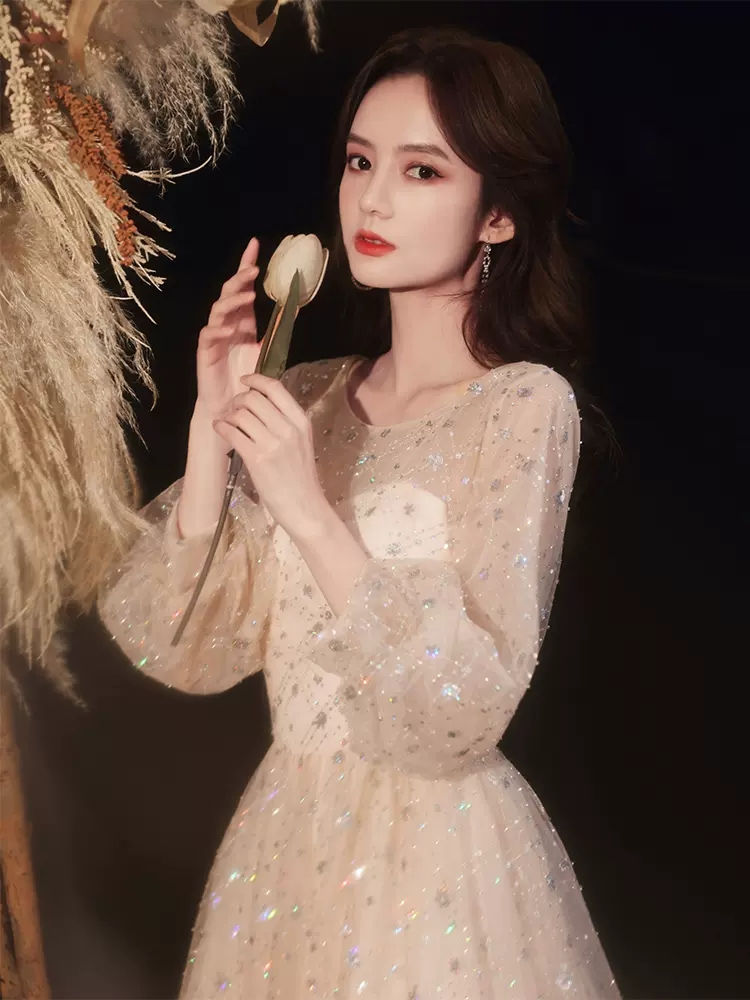 Tags: Champagne sequin evening dress, tulle formal gown, long sleeve evening dress, A-line formal dress, floor length evening gown, formal dress with built-in bra, elegant evening dress for women, plus size evening dress, custom size evening dress, formal dress for wedding guest, evening dress for 25-34 age group, affordable evening dress, illusion neckline evening dress, simple style evening dress.