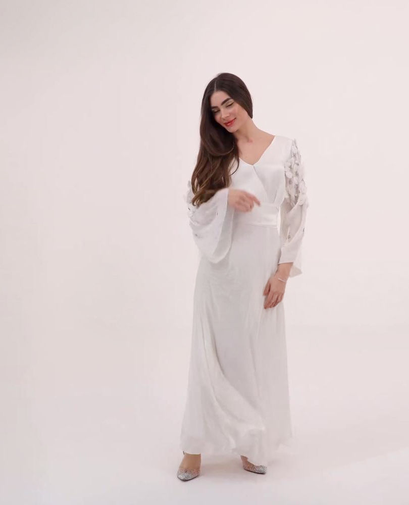 Tags:long sleeve v neck evening dress, elegant chiffon evening gown, appliqued evening dress, beaded formal dress, A line evening dress with sleeves, ankle length evening gown, modern style evening dress, formal evening dress with V neck, full sleeve chiffon dress, simple yet elegant evening dress, customized evening dress online, best evening dresses for women, affordable formal evening gowns, evening dress with built in bra.