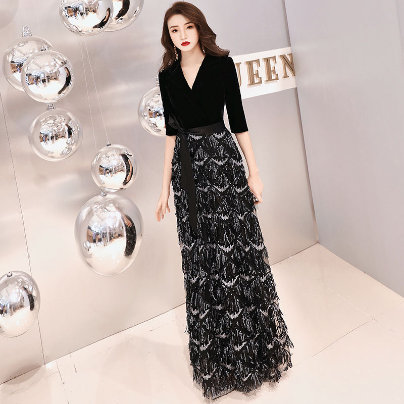 Black Velour Evening Dress, V-Neck, Half Sleeve, Sequined, A-Line, Floor-Length