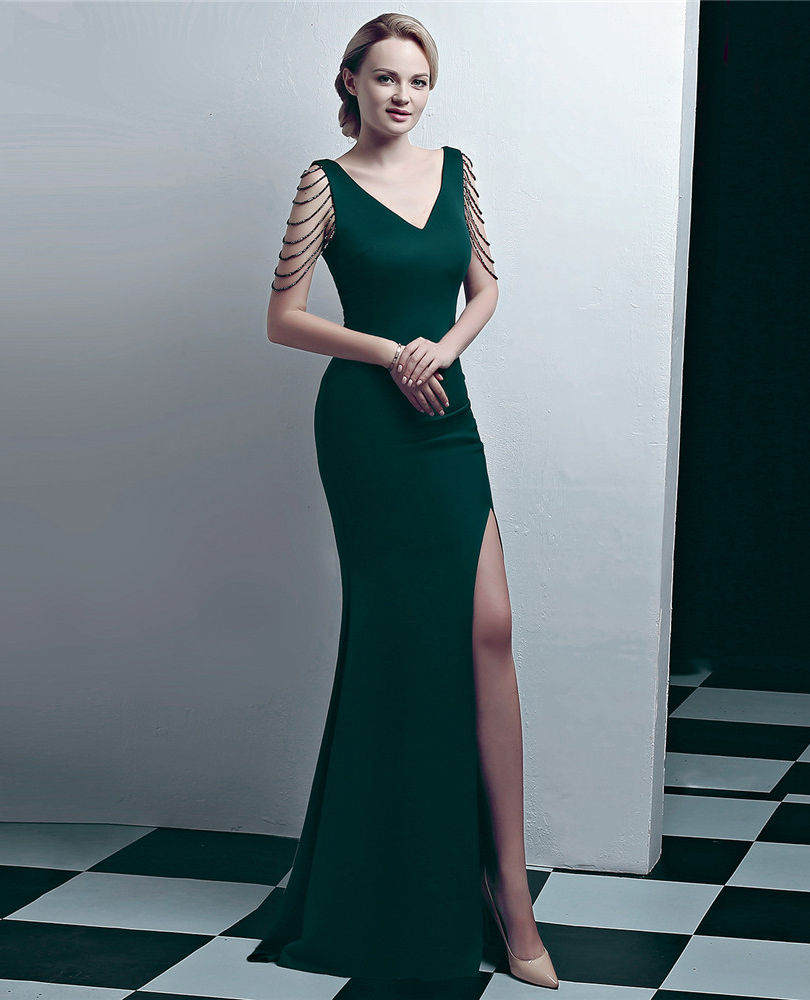 Green Mermaid Evening Dress V-Neck Sleeveless Slit Prom Gown Crystal Floor-Lengt