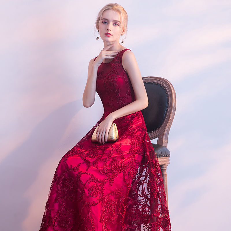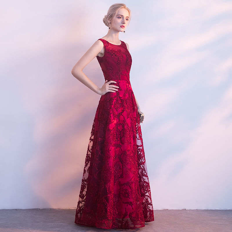 Tags:Elegant floor-length evening dress, wine red lace formal gown, sleeveless A-line evening dress, custom size evening dress, formal banquet dress, lace detail evening gown, empire waist evening dress, sleeveless formal dress for women, special occasion floor-length dress, affordable elegant evening dress, evening dress for 25-34 age group, simple style evening dress, formal dress with built-in bra, plus size floor-length evening dress.