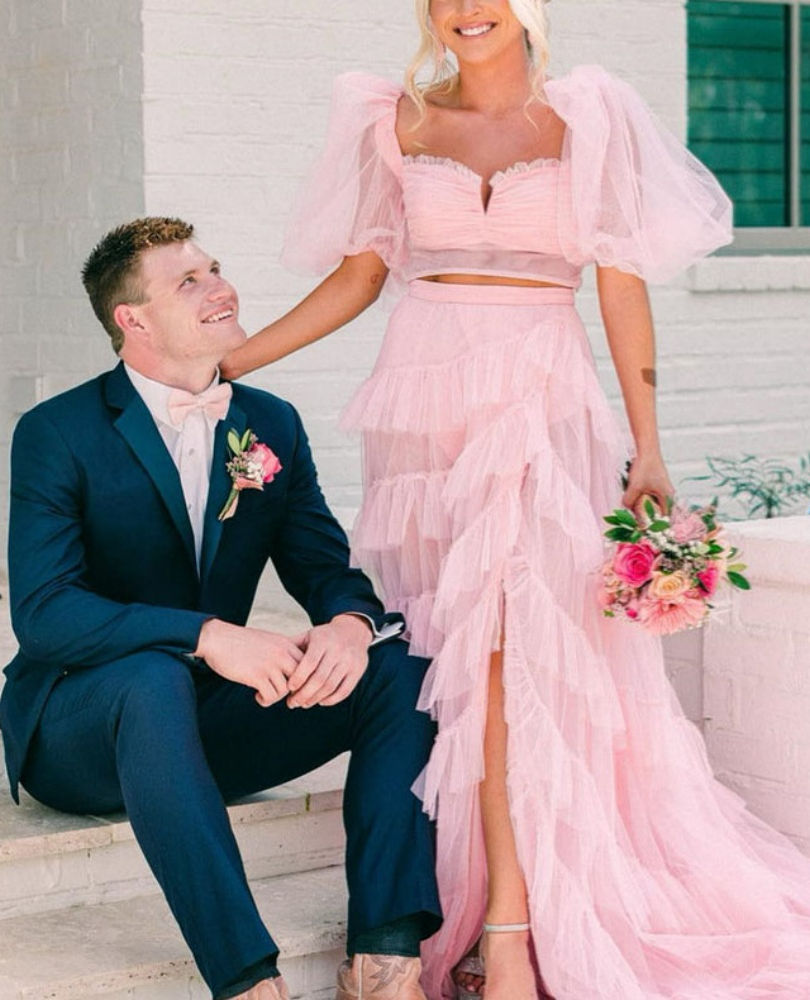Pink Prom Dresses Puffy Sleeve A-Line Party Gowns High Split Floor-Length Tulle