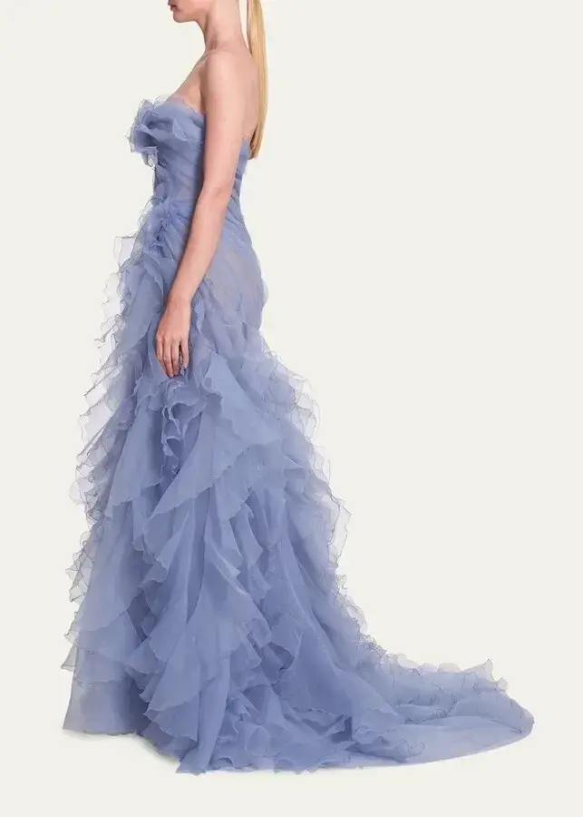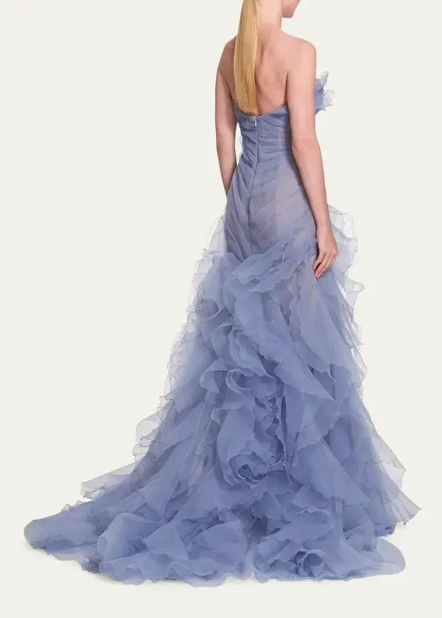 Strapless Backless Evening Dress A-Line Slit Floor-Length Tulle Pleat Formal Gow