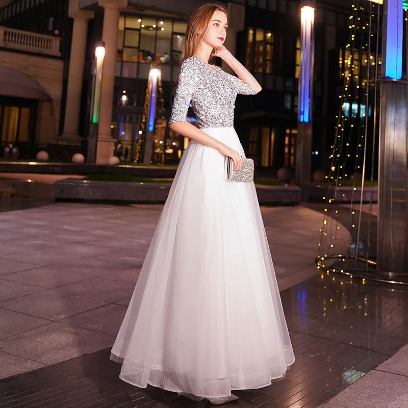 Tags:white sequin evening dress, long white formal dress, v-neck sequin gown, half sleeve evening dress, floor length white dress formal, empire waist evening gown, sequin dress for wedding guest, white tie event dress, elegant white evening gown, plus size white sequin dress, custom size evening dress, affordable white evening dress, white dress with sleeves formal, simple white evening dress.