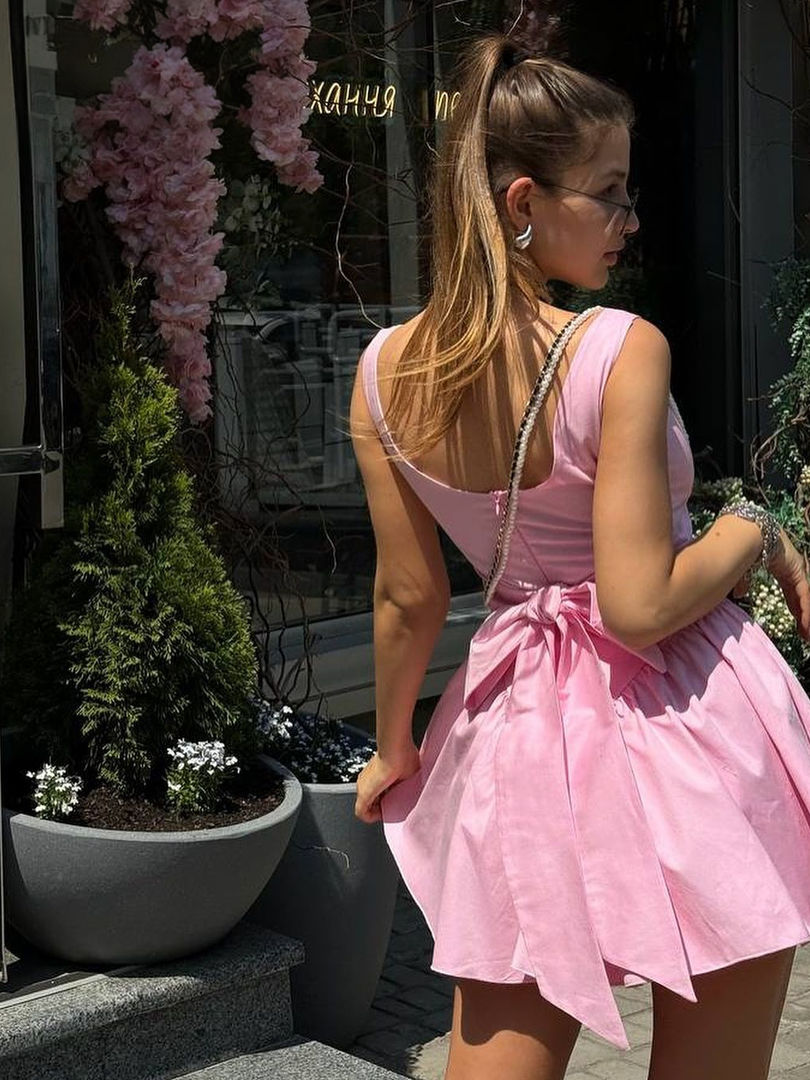 Pink Satin Homecoming Dresses Party Prom Gowns Sleeveless Mini A-Line Ruched Tie