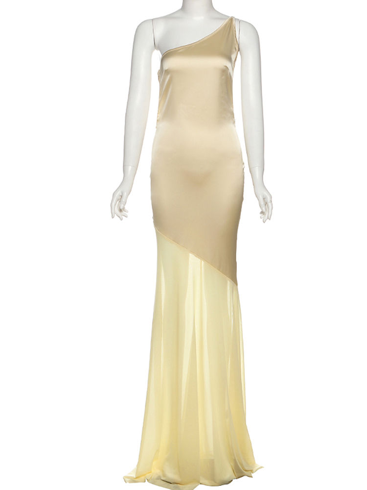 Asymmetrical Neck Maxi Dress, Backless Sheath Gown, Sleeveless Patchwork