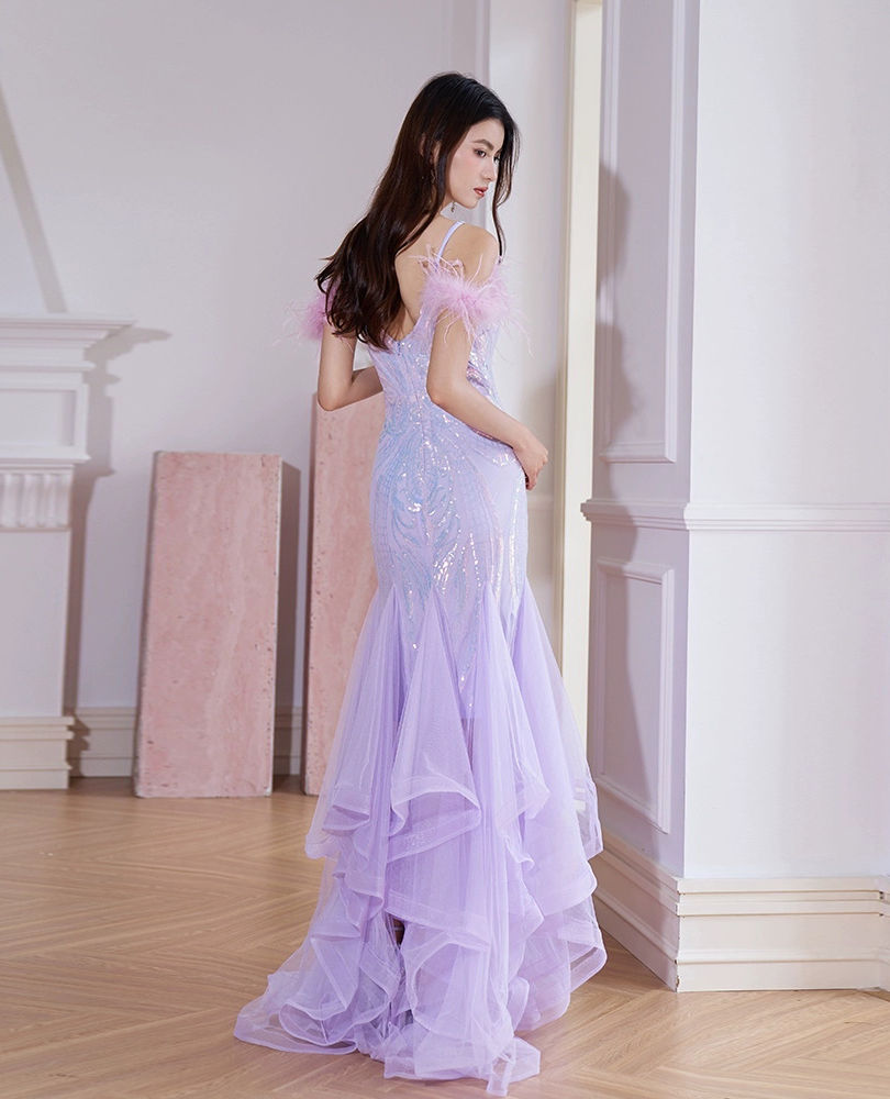 Tags:mermaid sequin evening dress, backless formal gown with feathers, v-neck spaghetti strap prom dress, floor-length trumpet silhouette gown, sexy sequin dress for wedding guest, elegant gala party dress, feather trim mermaid evening gown, formal birthday dinner dress, sleeveless sequin mermaid dress, open back formal evening dress, black tie event dress for women, sparkly floor length prom gown, v-neck sequin dress with open back
