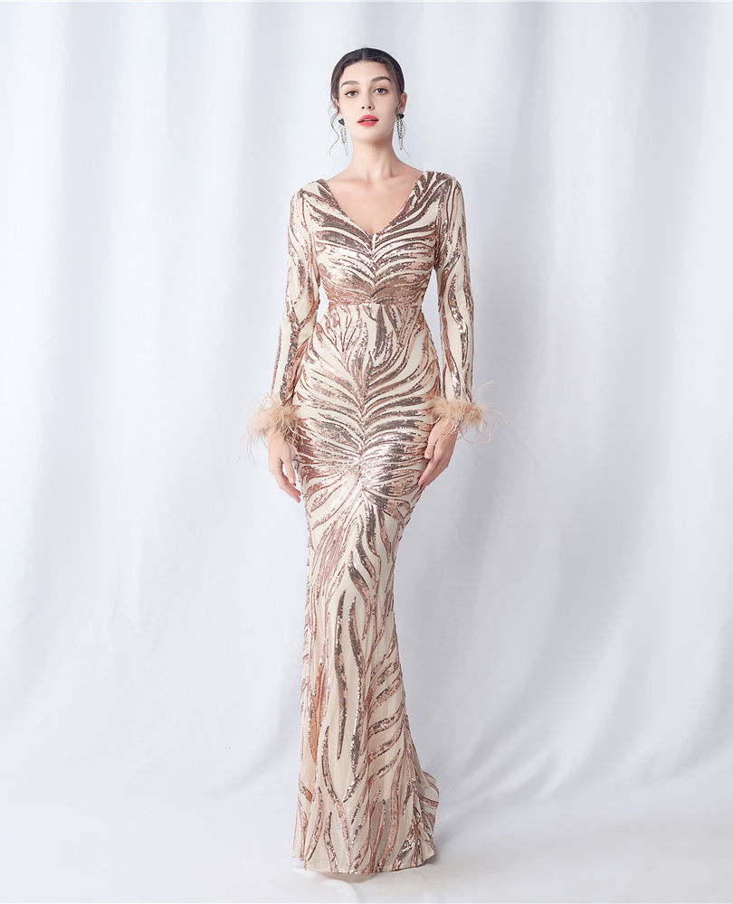 Tags:long sleeve sequin mermaid prom dress, v-neck formal evening gown with sleeves, sparkly mermaid dress with open back, black tie event dress with feather details, floor length sequin gown for wedding guest, vintage style full sleeve evening dress, trumpet silhouette formal dress with sequins, women's formal party dress with v-neck, open back mermaid gown with feather trim, sequin stripe pattern evening dress, full sleeve sparkly formal gown, elegant v-neck mermaid dress for prom, buy long sleeve sequin evening gown online, floor length trumpet dress for formal event