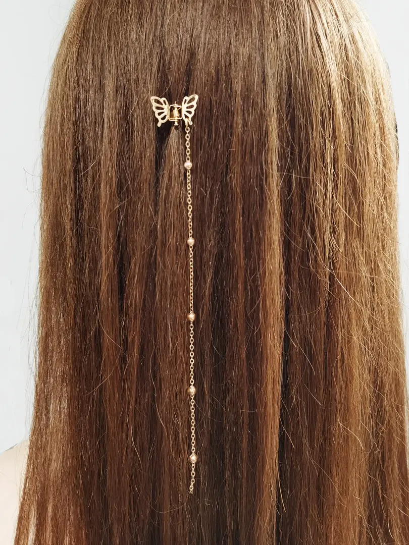 Embrace your whimsical side with this delicate butterfly hair clip (by Cusuti). Featuring a unique hollow butterfly design adorned with cascading simulated pearls, it adds a touch of nature-inspired elegance to your hairstyle. Made from a combination of zinc alloy and simulated pearls, it offers a secure hold for various hair types and styles. Perfect for weddings, parties, birthdays, or everyday wear, this versatile hair clip complements a variety of looks.