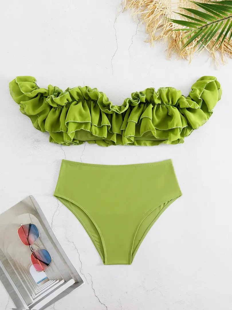 Double Ruffle Bikini Swimsuit - High Waist Solid Swimwear