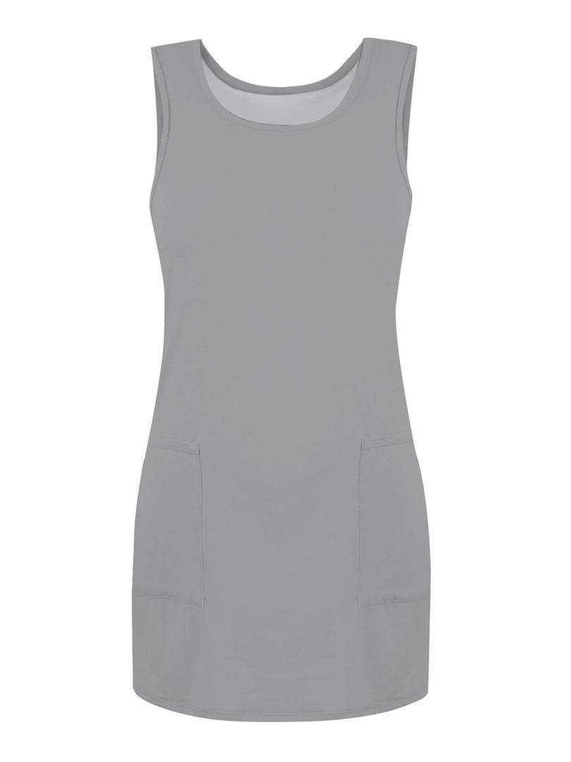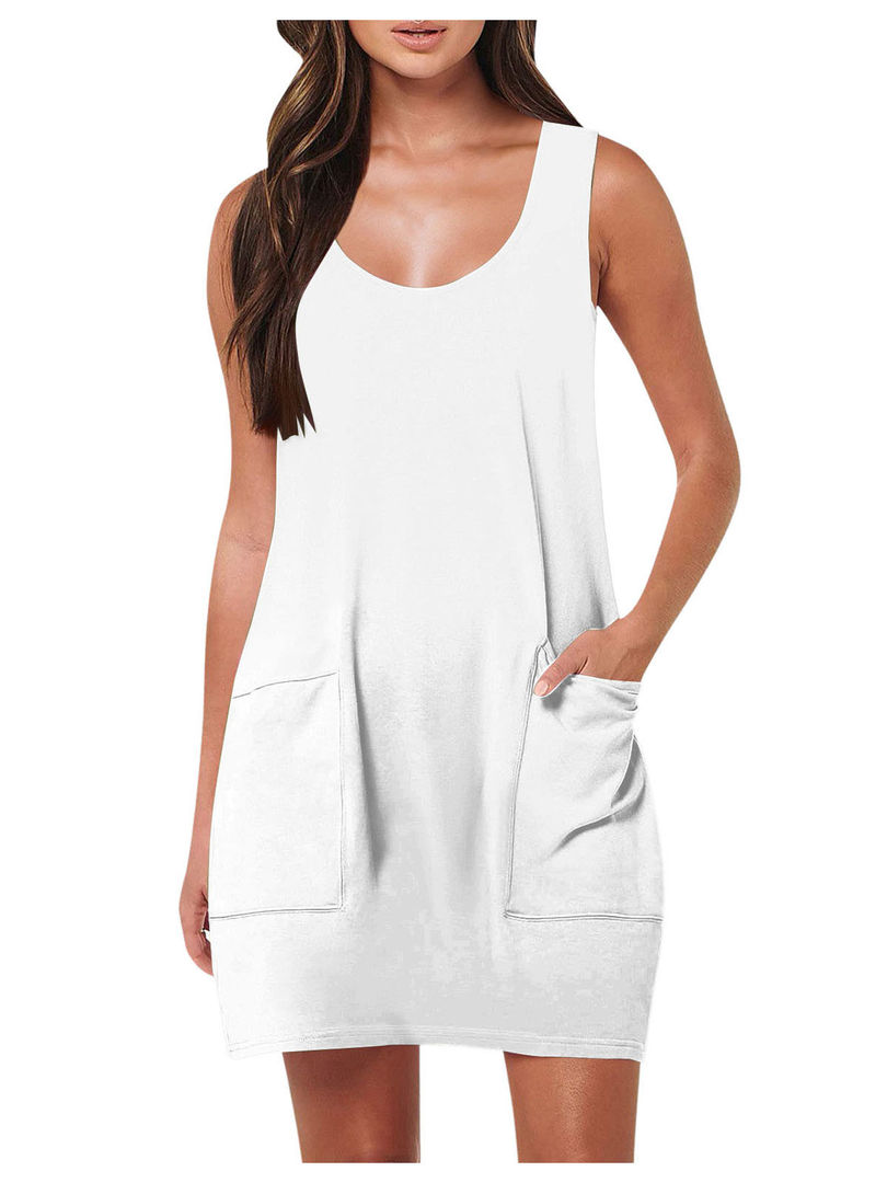 This is a casual sleeveless dress designed for easy wear. It features a comfortable A-line silhouette and a knee-length hem, making it a versatile addition to your wardrobe for warmer weather.