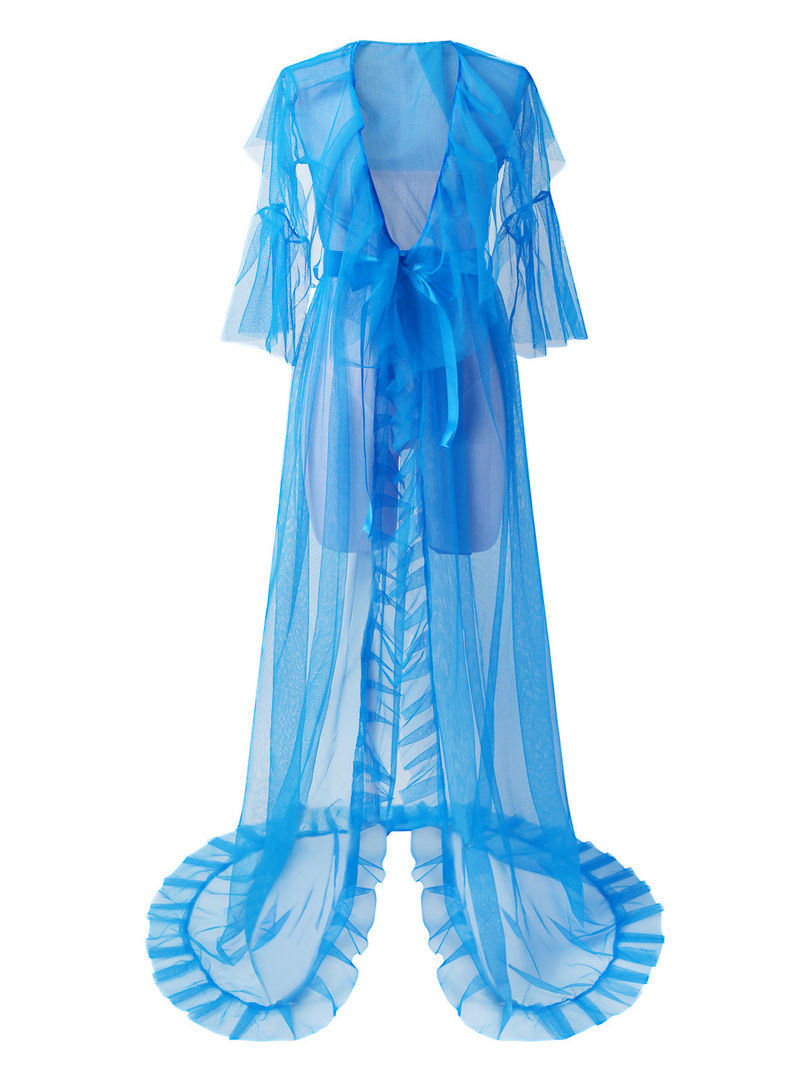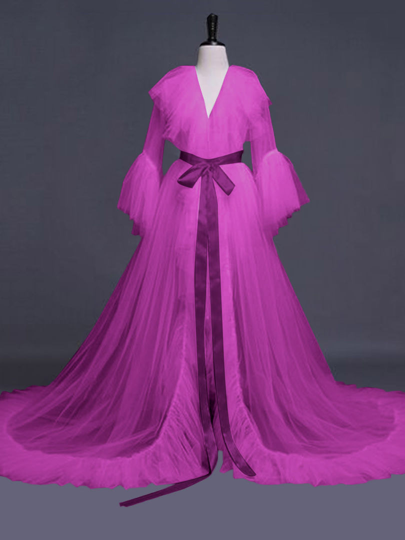 Sexy Tulle Lace Robe Floor Length V-Neck Full Sleeve Wedding Guest