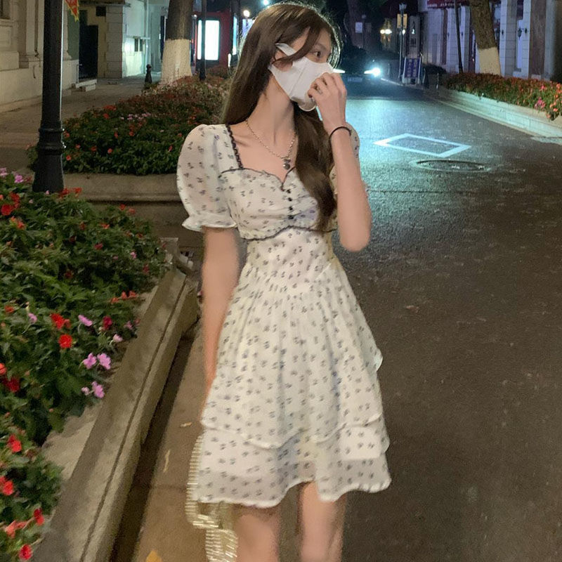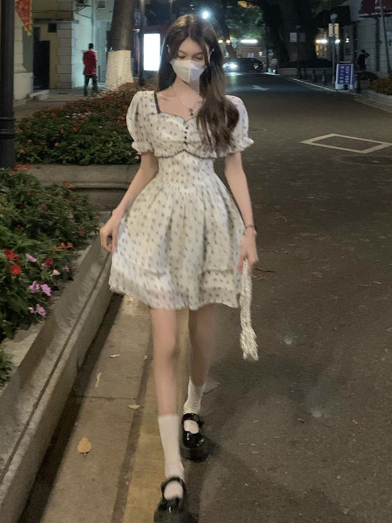 Tags: light apricot knit dress, square collar puff sleeve dress, A-LINE dress women, women's casual knit dress, short puff sleeve mini dress, pullover knit dress for daily wear, soft fabric bow detail dress, Korean style casual dress, summer A-LINE dress women, cotton polyester blend dress, empire waist mini dress, women's spring summer fashion, lightweight knit A-LINE dress, stylish women's casual dresses