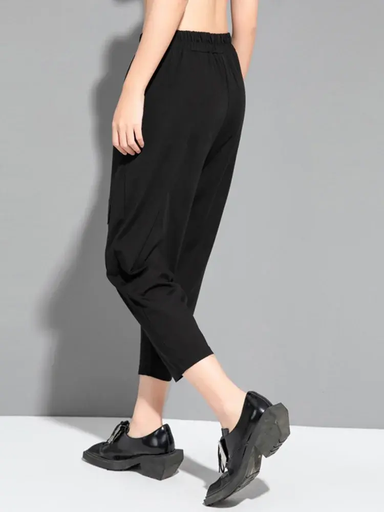 Tags: women's black harem pants, high waisted stretch pants, casual pants with button detail, lightweight cotton blend pants, relaxed fit everyday pants, street style comfort pants, black jersey pants women, unique button harem pants, breathable casual trousers, versatile black pants for women, pants for daily wear women, edgy high waist trousers, flattering black relaxed pants, comfortable travel pants women.