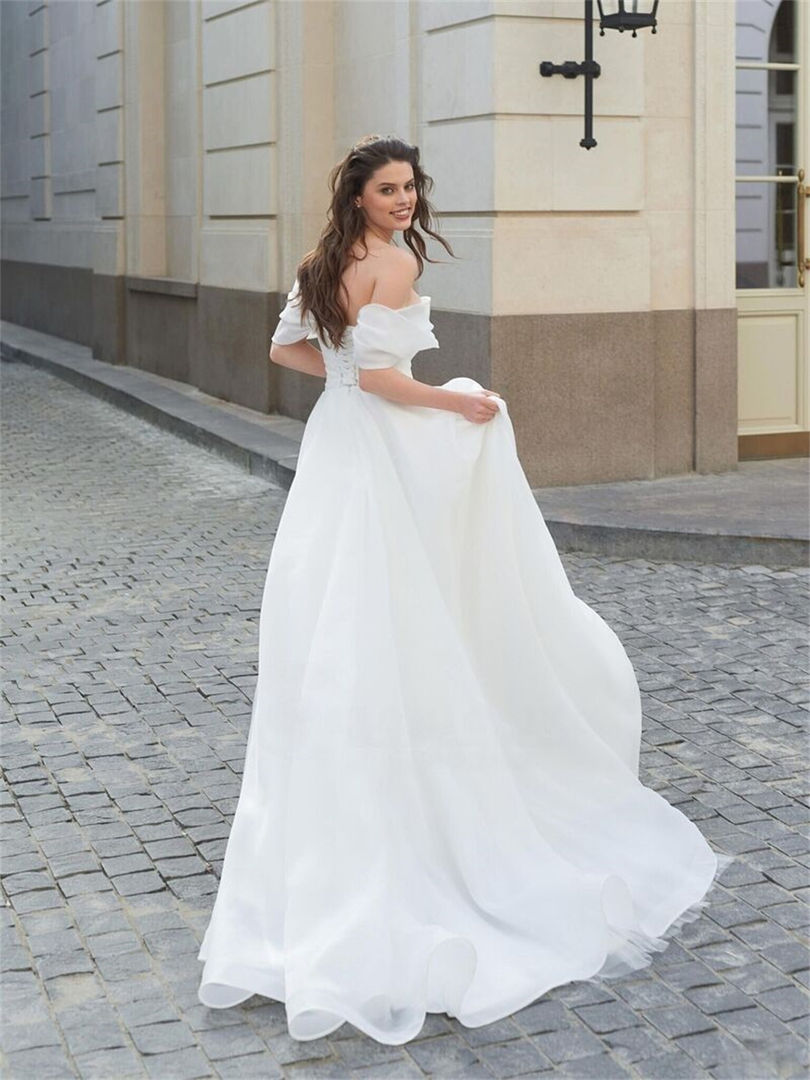 Off Shoulder A-Line Tulle Evening Dress Pleated Sweep Train Formal Gown Microfib