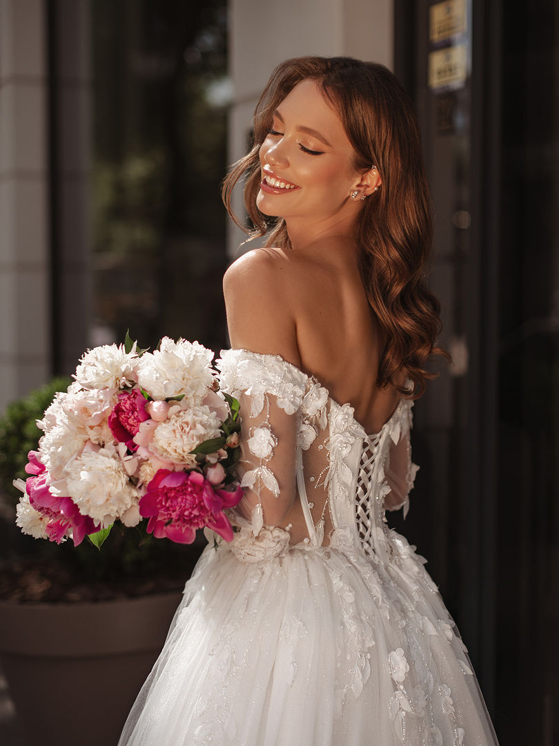 - A delicate fingertip veil to complement the lace details.