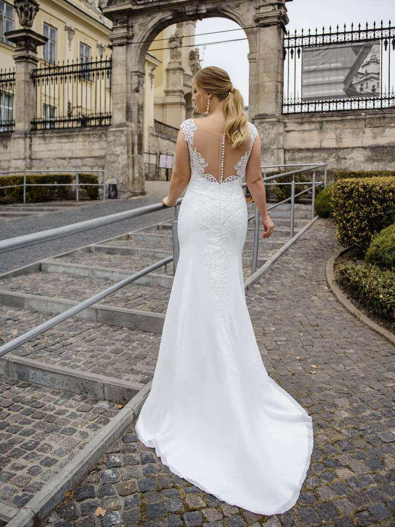 - A delicate fingertip veil to complement the sheer back.