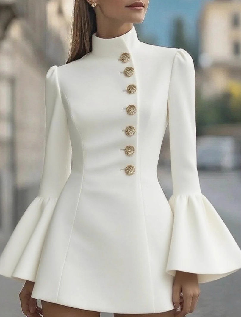 Mini A-Line Dress, Solid Color, Long Flare Sleeve, Half High Collar, Slim Polyes