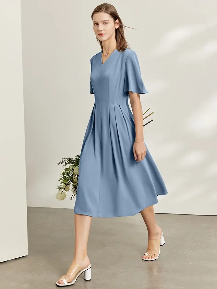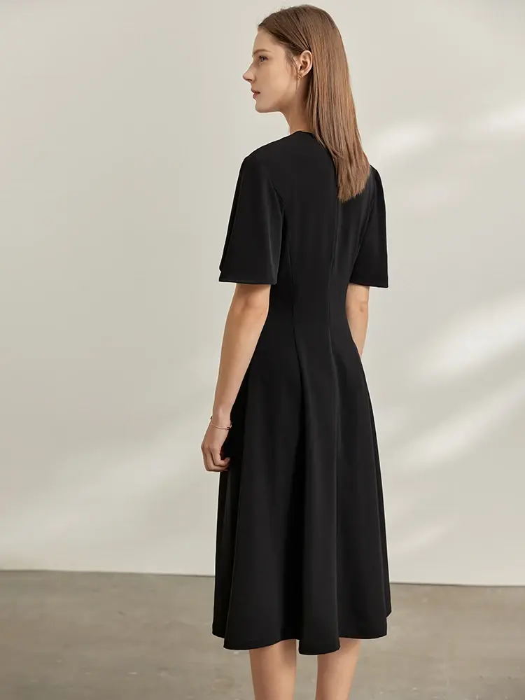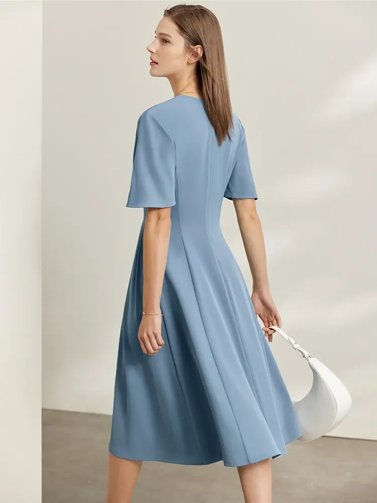 Embrace timeless elegance with this effortlessly chic dress. The A-line silhouette flatters every figure, while the V-neckline adds a touch of sophistication. Crafted with a blend of polyester and spandex, this dress offers both comfort and style, making it perfect for a variety of occasions. This dress is made with a comfortable blend of polyester and spandex. This versatile dress is perfect for everything from office meetings to evening events.