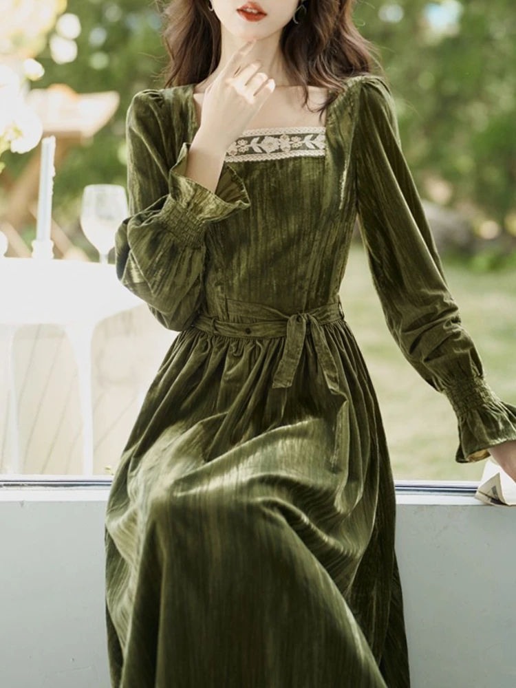 Tags:velvet midi dress women, lace patchwork dress, slim fit korean dress, elegant winter dress, vintage style midi dress, women's office dress, long sleeve velvet dress, a-line midi dress, empire waist dress, square collar dress, solid color midi dress, women's winter party dress, korean style velvet dress, women's formal midi dress.