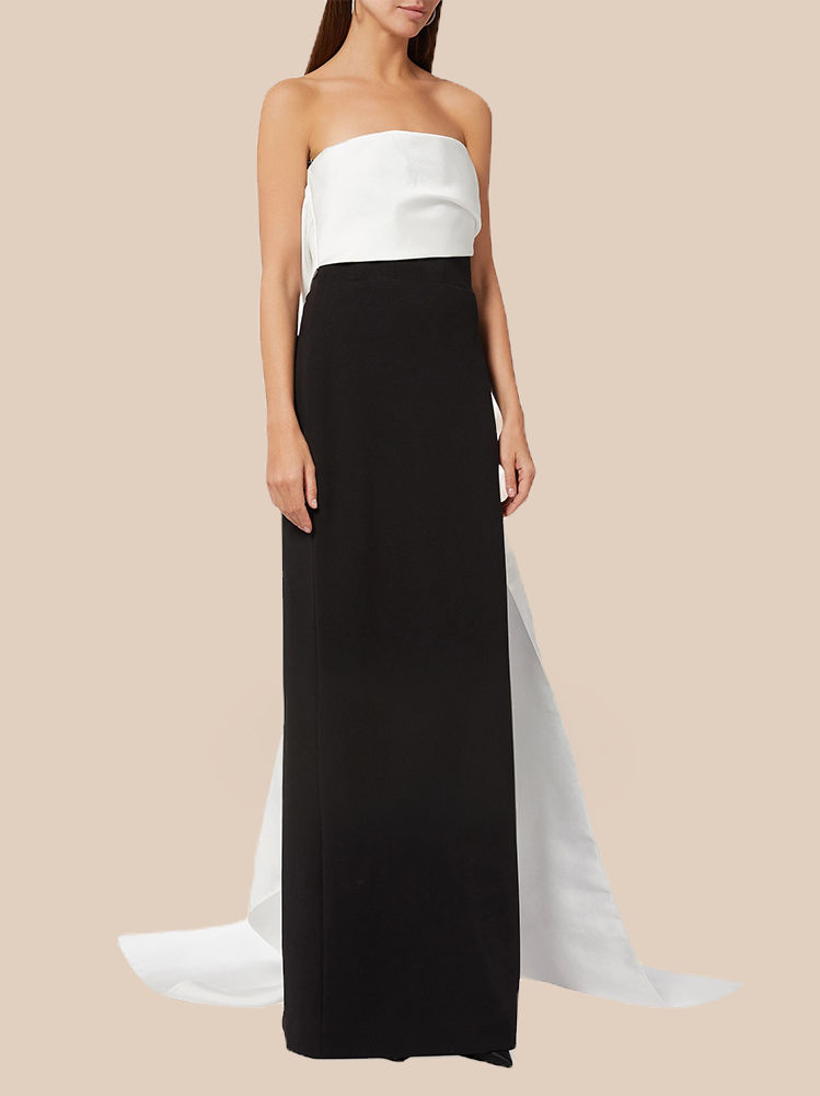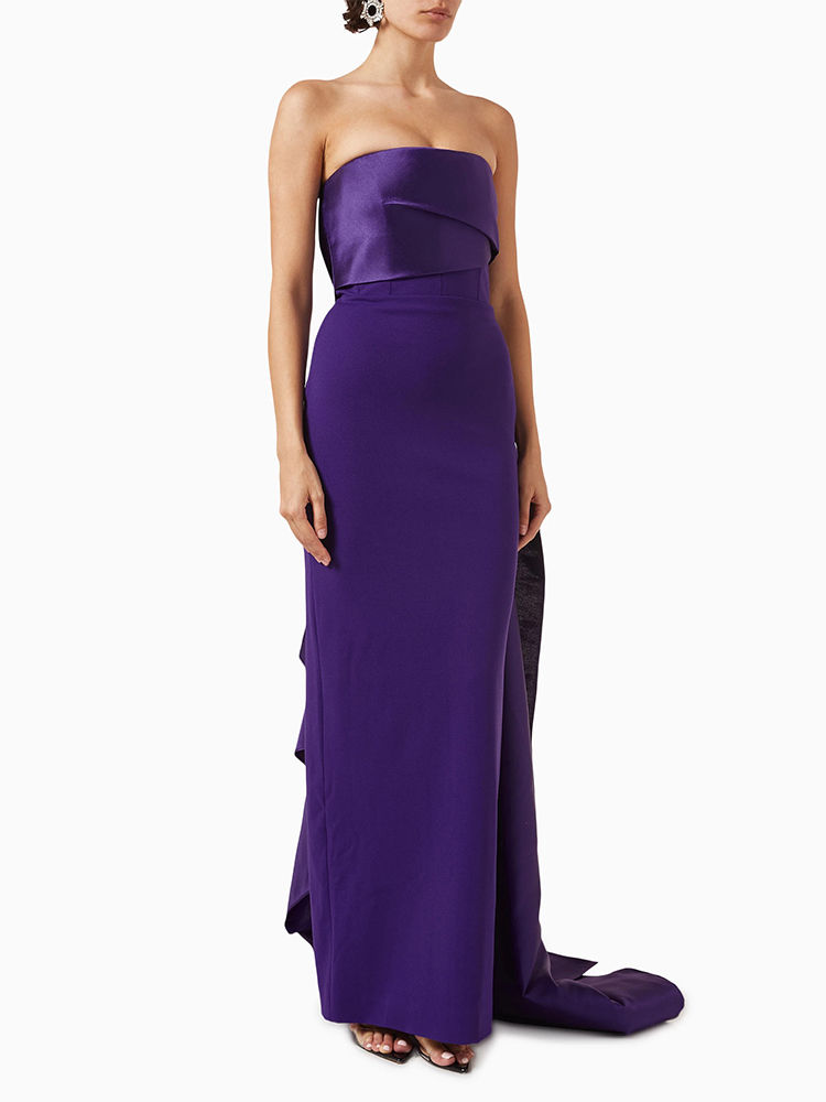 This floor-length evening dress offers a sleek, straight silhouette designed to flatter. With its strapless neckline and elegant draping, it's built for effortless sophistication at any formal event. A built-in bra ensures a smooth, confident fit.