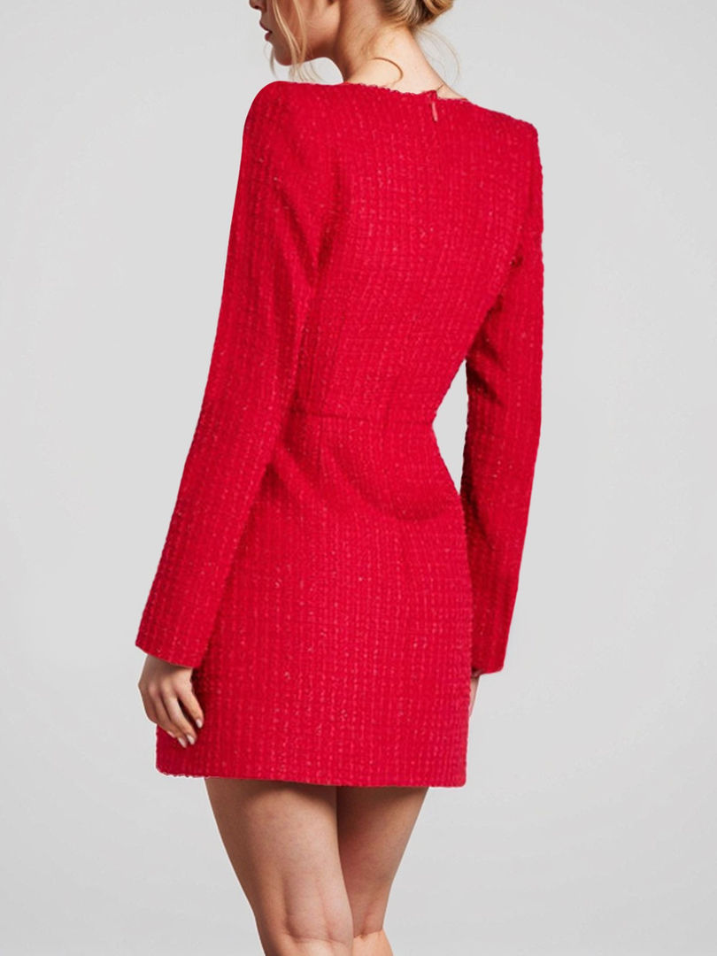 This is a sleeveless A-line dress that falls to the knee. It has a simple O-neckline and a single-breasted closure, making it an easy option for casual days. The fabric offers high stretch for comfortable movement.