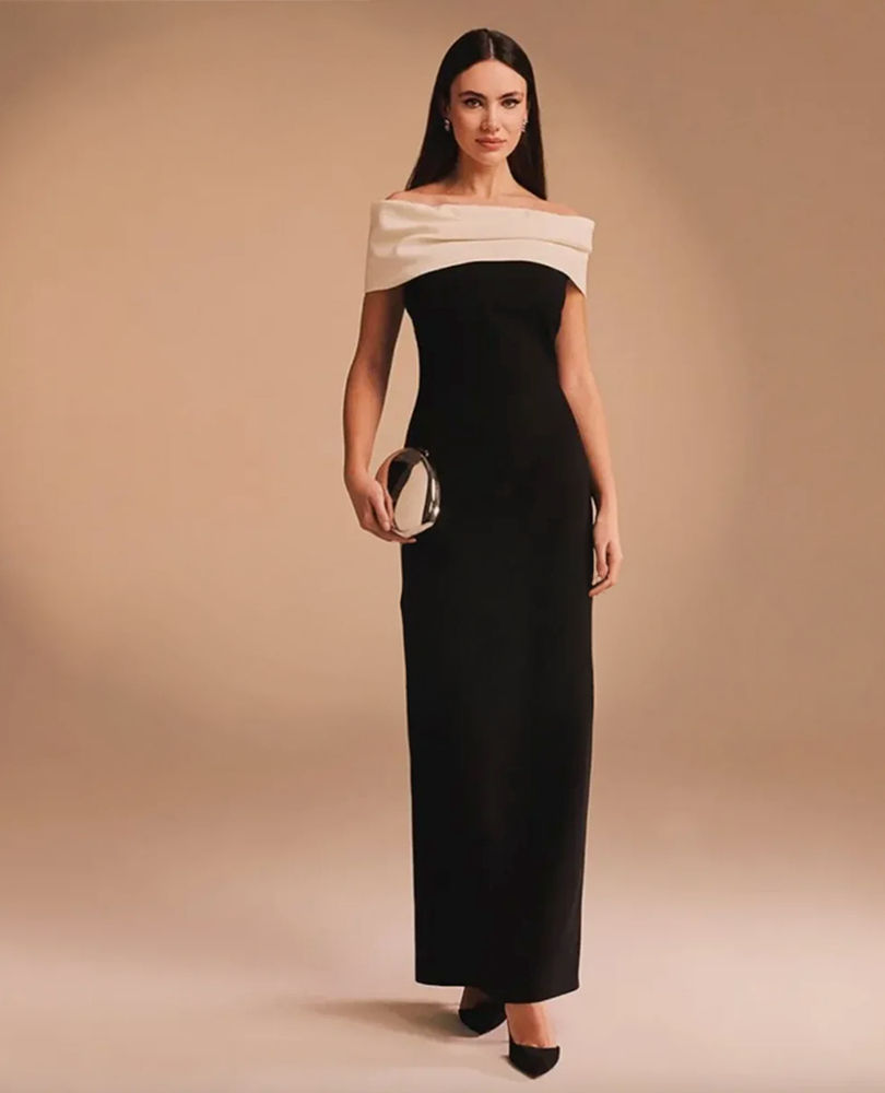 Tags:off the shoulder evening dress, ankle length formal gown, sleeveless evening dress, pleated evening gown, boat neck evening dress, straight silhouette dress, modern style evening dress, built in bra evening dress, formal evening dresses for women, elegant evening gowns, simple evening gowns, polyester evening dress, jersey evening dress, contrast color evening dress