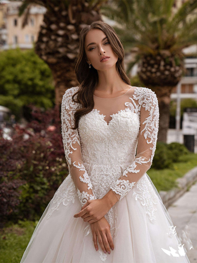 A-Line Wedding Dresses V-Neck Long Sleeves Lace Applique Bridal Grown Button Bac