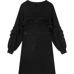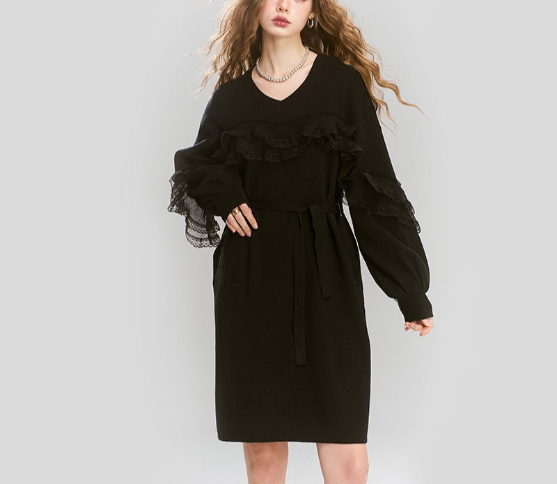 Hooded Knitted Dress, A-Line Pullover Dress, Black Vintage Style, Lace Trim