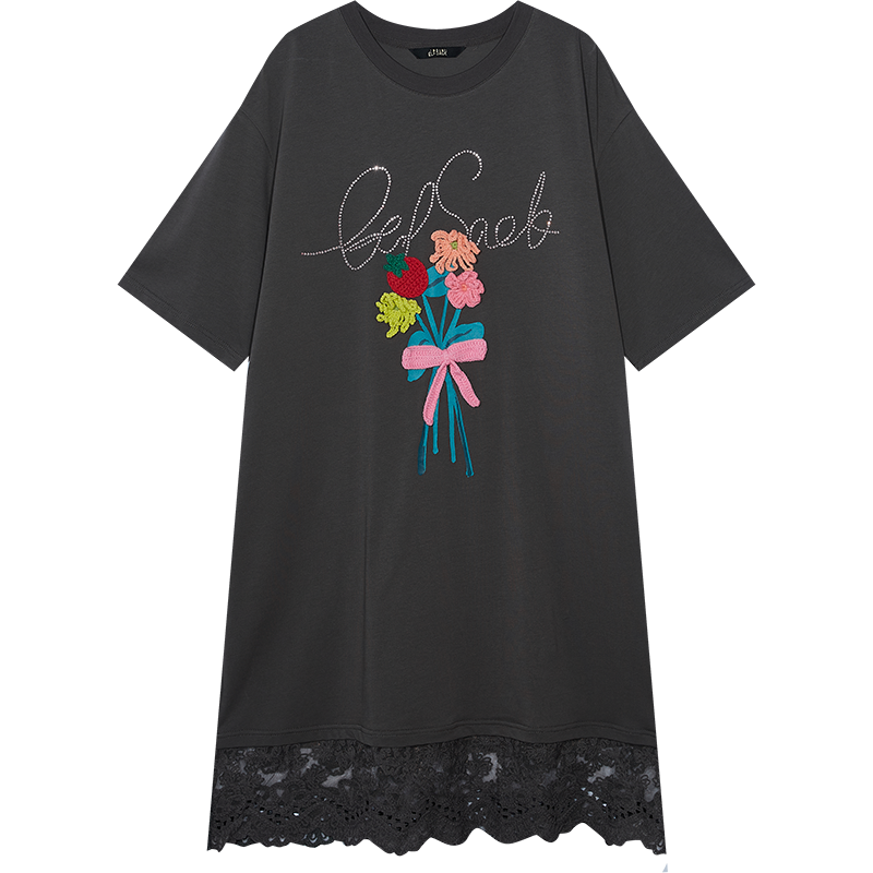 Printed Mid-Calf Dress, Straight O-Neck, Loose Fit Cotton Knit with Lace