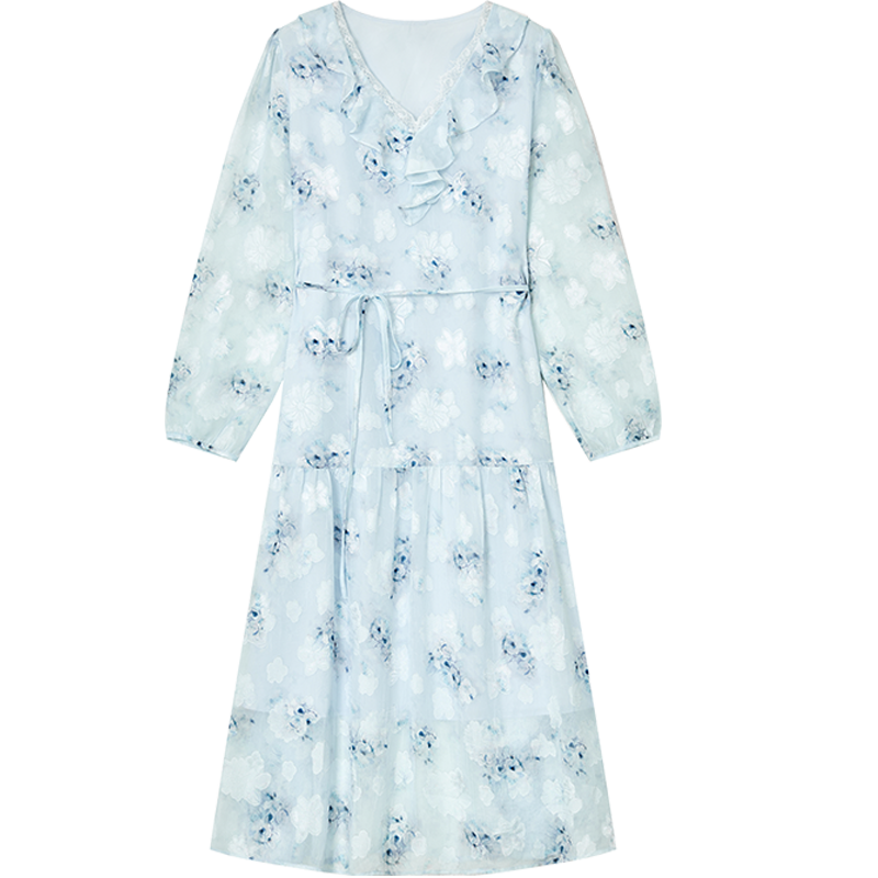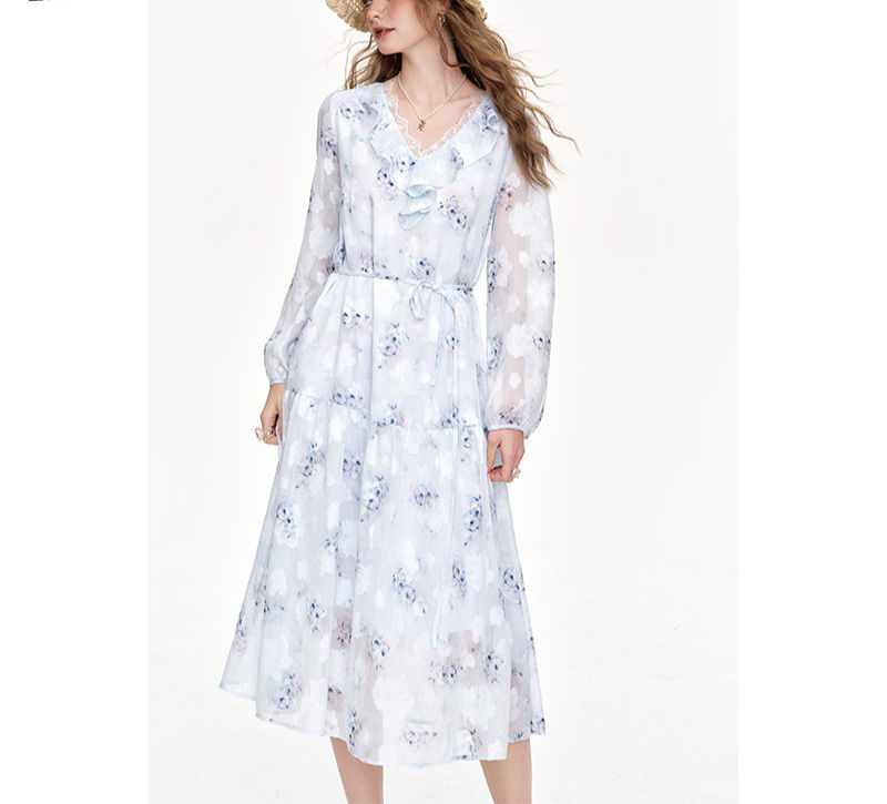 Long Sleeve Floral Dress, V-Neck Mid-Calf Pullover, Black Prairie Chic Lace-Up