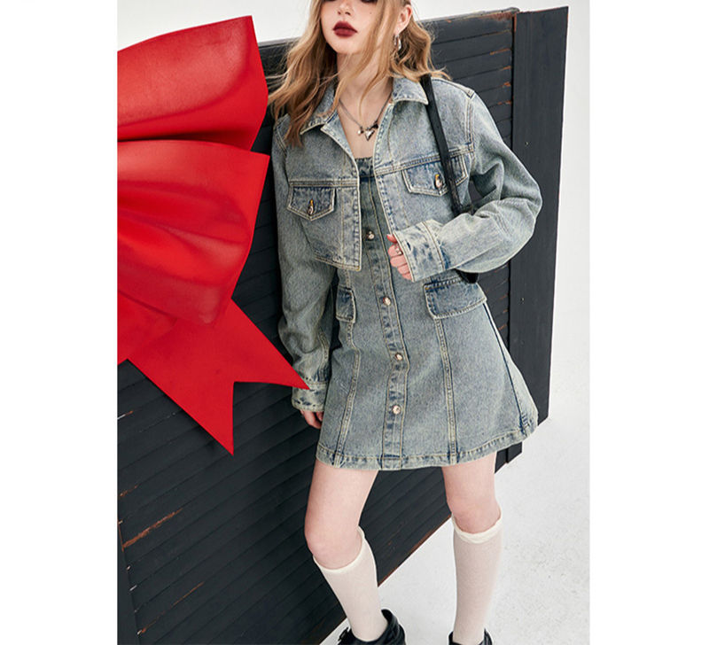 Tags: two piece denim dress set for women, denim skirt and top set, slim fit denim co-ord set, American style denim outfit, spring 2024 denim dress set, casual street style denim set, women's denim matching set, light wash denim two piece outfit, young style denim dress and jacket, cute denim outfit for summer, what to wear to a spring festival, denim on denim outfit set, button up denim dress set, sweet style denim co-ord