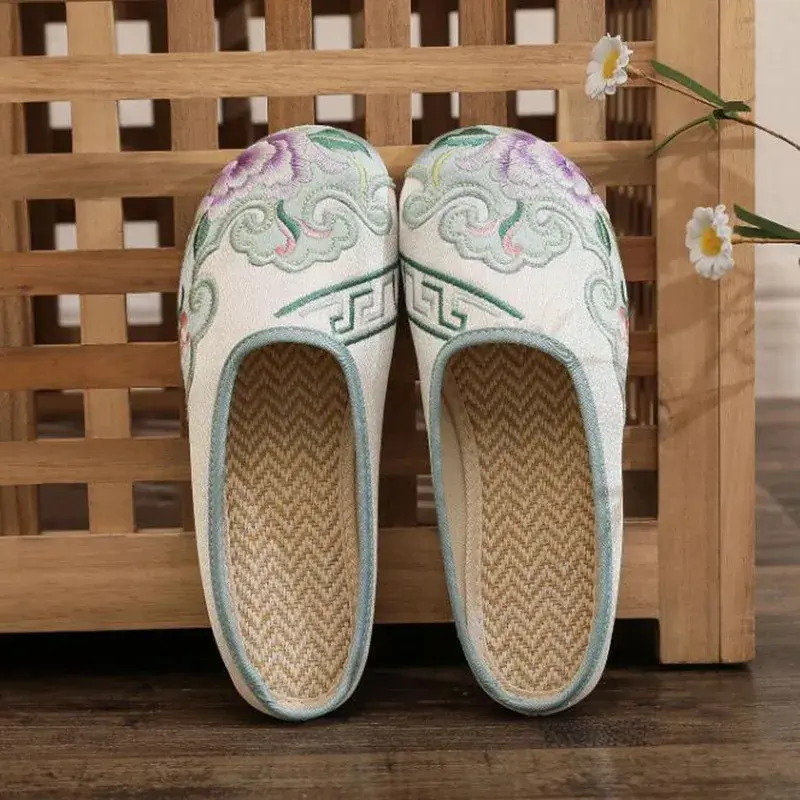 Embroidered Canvas Slippers Casual Mules Flat Open Toe Ethnic Footwear