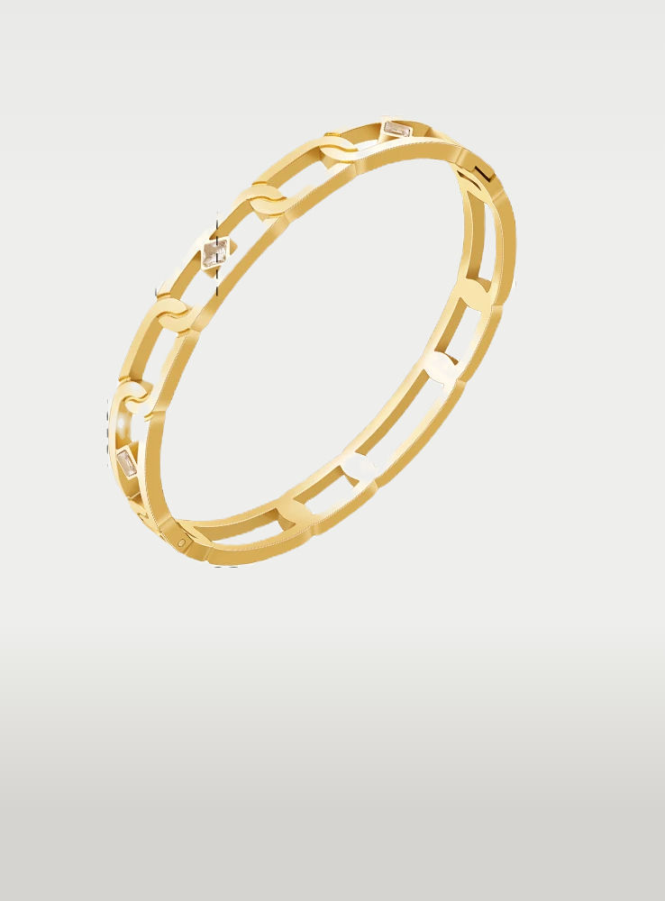 - Add a touch of modern sophistication to your look with this sleek geometric bangle. Available in gold or silver plating, this bracelet features a bold design that complements any outfit. Made with lightweight stainless steel for comfortable everyday wear.
