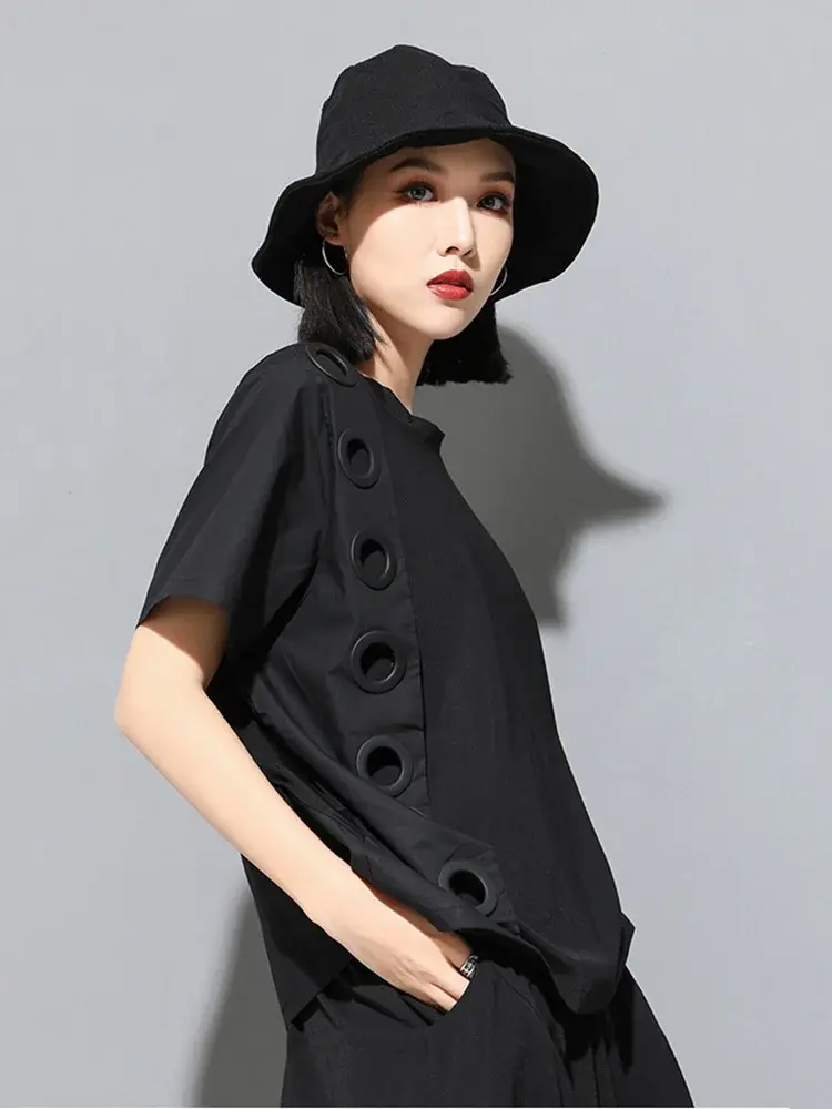 This comfy black tee with a relaxed fit and hint of stretch is a must-have for spring and summer. Made from a breathable cotton blend for day-long comfort, it pairs well with anything from shorts to skirts. A timeless wardrobe essential that can be dressed up or down. (138 characters)