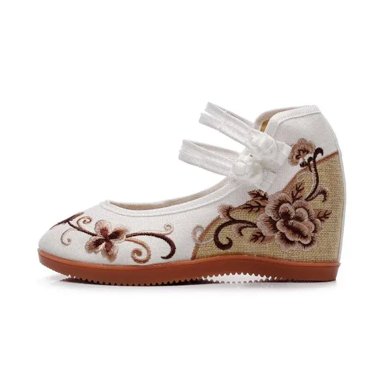 Ethnic Embroidered Wedge Pumps - Ankle Strap Vint Cotton Fabric Shoes