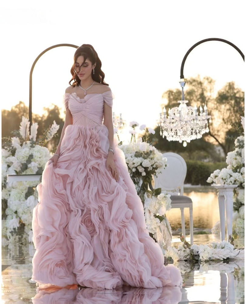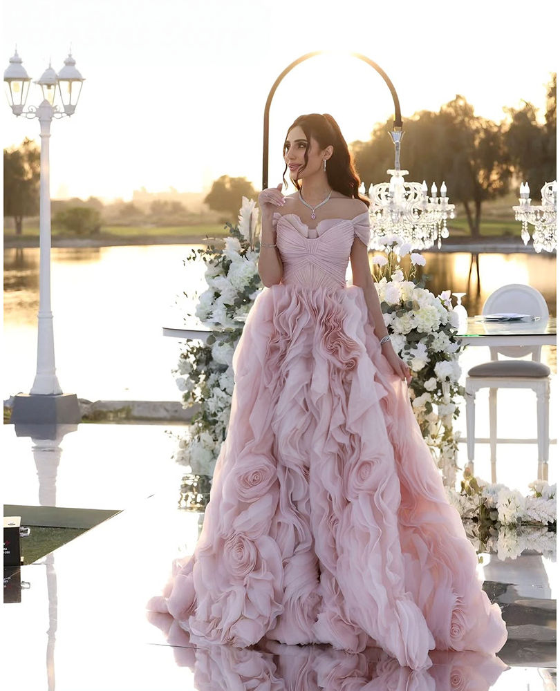 Pink Prom Dress Off Shoulder 3D Flowers A-Line Organza Evening Ball Gown Dresses