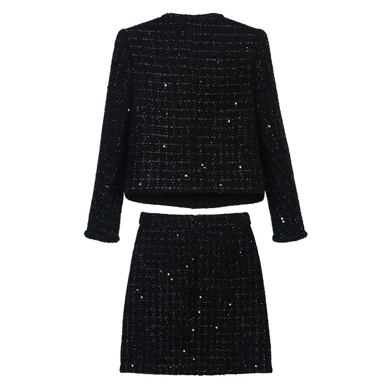 Tags: sequin tweed skirt suit, women's plaid skirt suit, office lady skirt suit, single breasted tweed jacket, autumn winter skirt suit, middle age women's suit, fashion celebrity skirt suit, sequin embellished tweed suit, professional women's skirt suit, woven fabric skirt suit, round neck jacket skirt set, women's business attire, tweed jacket and skirt outfit, sequin tweed suit for women.