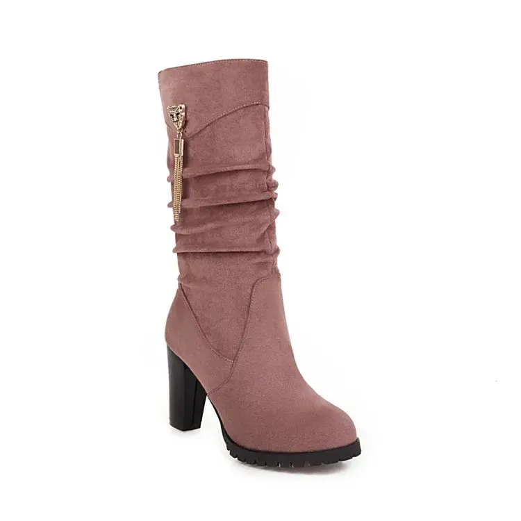 Faux Suede Boots Pleated Mid-Calf Booties Flock Detailing