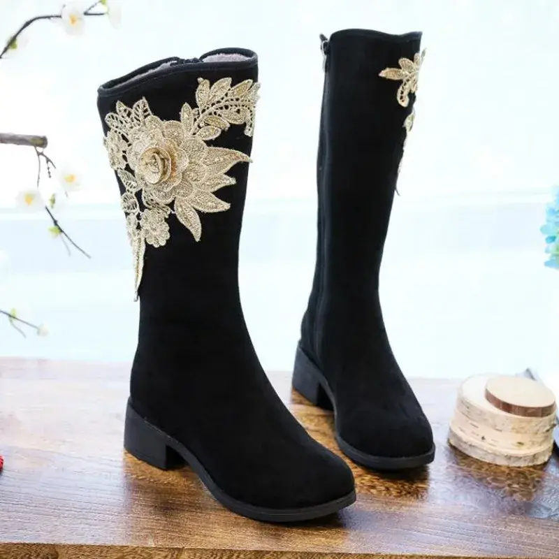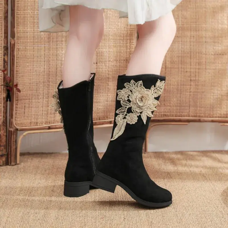 Faux Suede Mid Calf Boots Chunky Heel Long Booties Ethnic Style