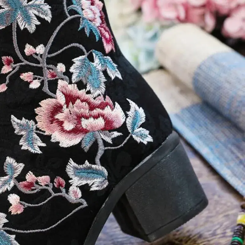 These ankle boots combine comfort and style with a touch of ethnic flair. Featuring a unique embroidered floral pattern, these boots are perfect for adding a touch of personality to any outfit.