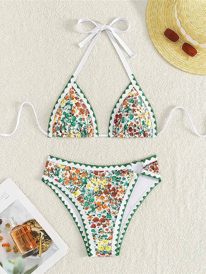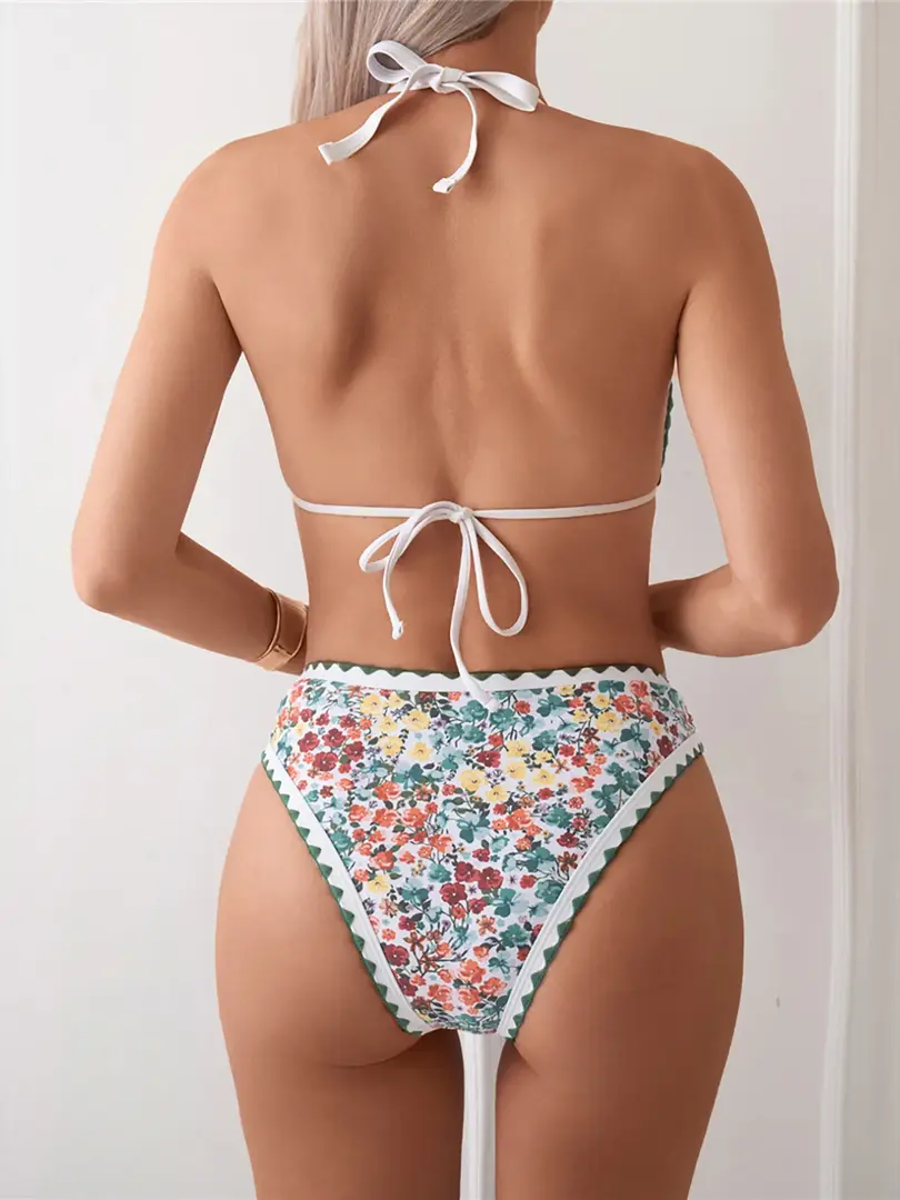 Make a splash this summer with the Floral Halter Bikini Swimsuit. Featuring a charming floral print and a flattering halter neck design, this two-piece bathing suit combines elegance with a playful touch for your next beach or pool outing.