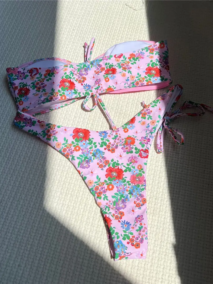 Floral Print Bandeau Bikini Top & Bottom Swimsuit Set