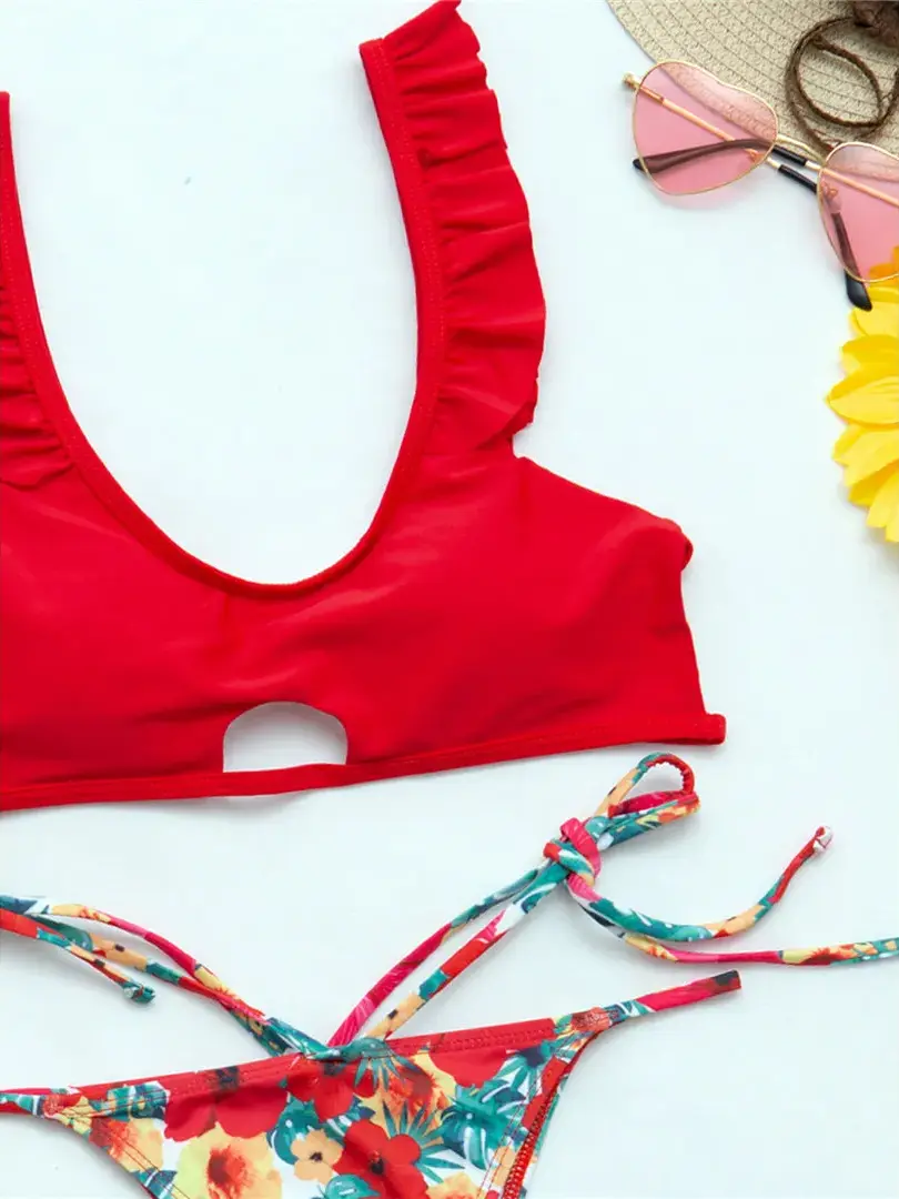 Floral Print Ruffled Bikini Set - Push Up Padded Swimsuit