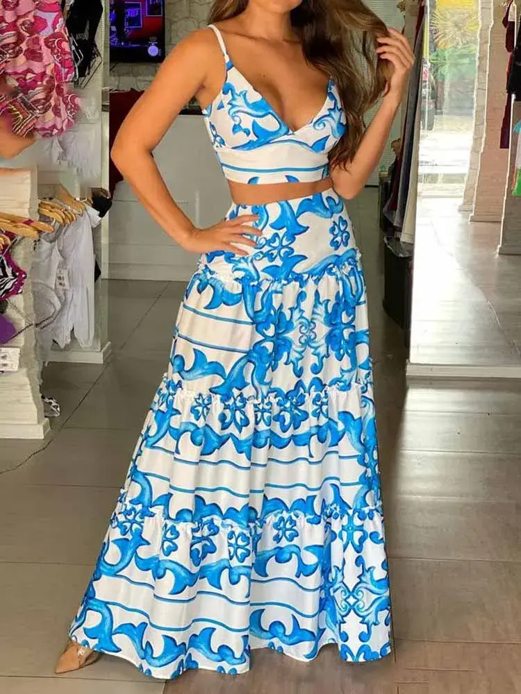 Floral Print V-Neck Two Piece Dress Suit Beachwear Outfit