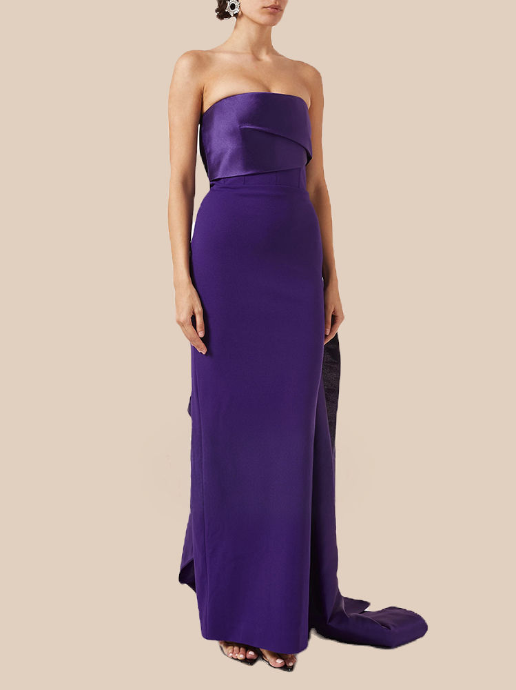 This floor-length evening dress is designed for impact, featuring a sleek strapless neckline and elegant draping that flows into a sophisticated sweep train. With a built-in bra for seamless support, it’s ready to make a statement at your next formal event. This piece offers a refined silhouette that moves with you.