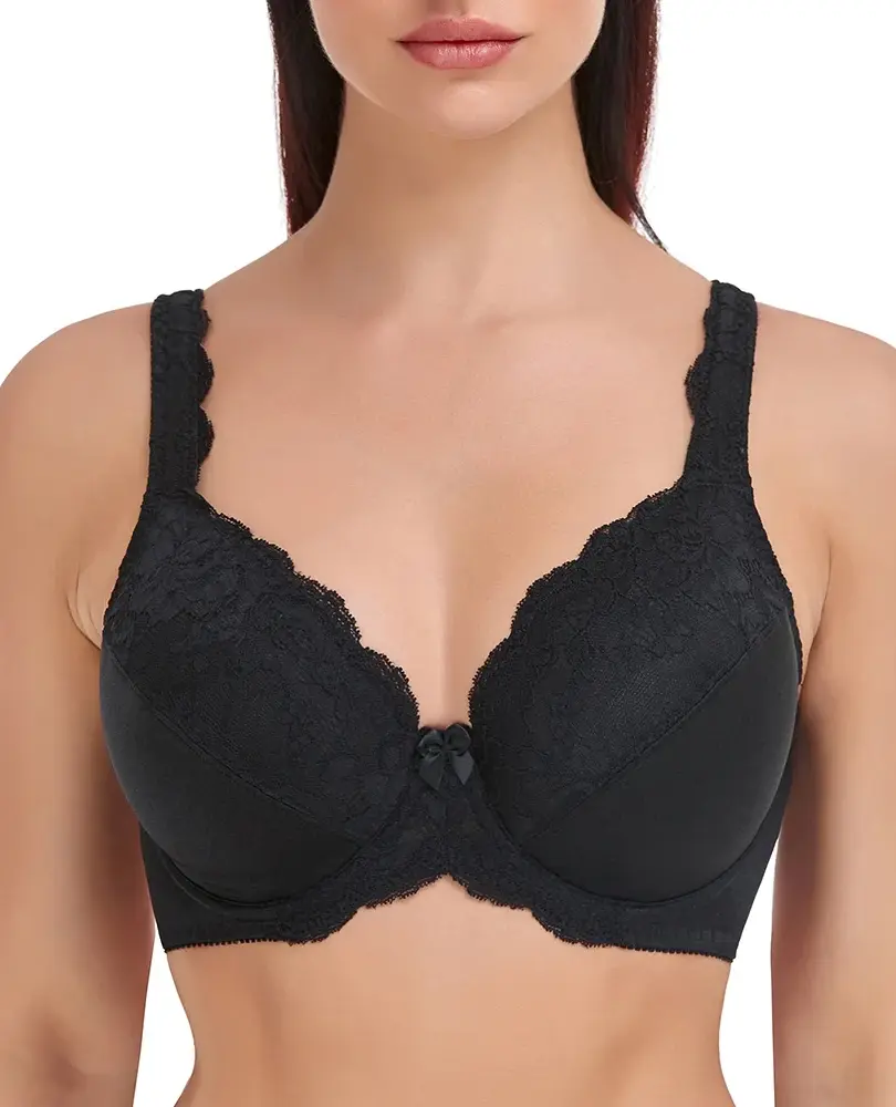 Elevate your everyday look with this comfortable and stylish bra. Featuring a minimizer design and full cup coverage, this underwire bra provides excellent support and a flattering silhouette. Crafted from a blend of delicate lace and breathable fabrics, it offers both comfort and sophistication. This bra is made from a combination of polyester, lace, and polyamide. Perfect for everyday wear, from casual outings to special events.